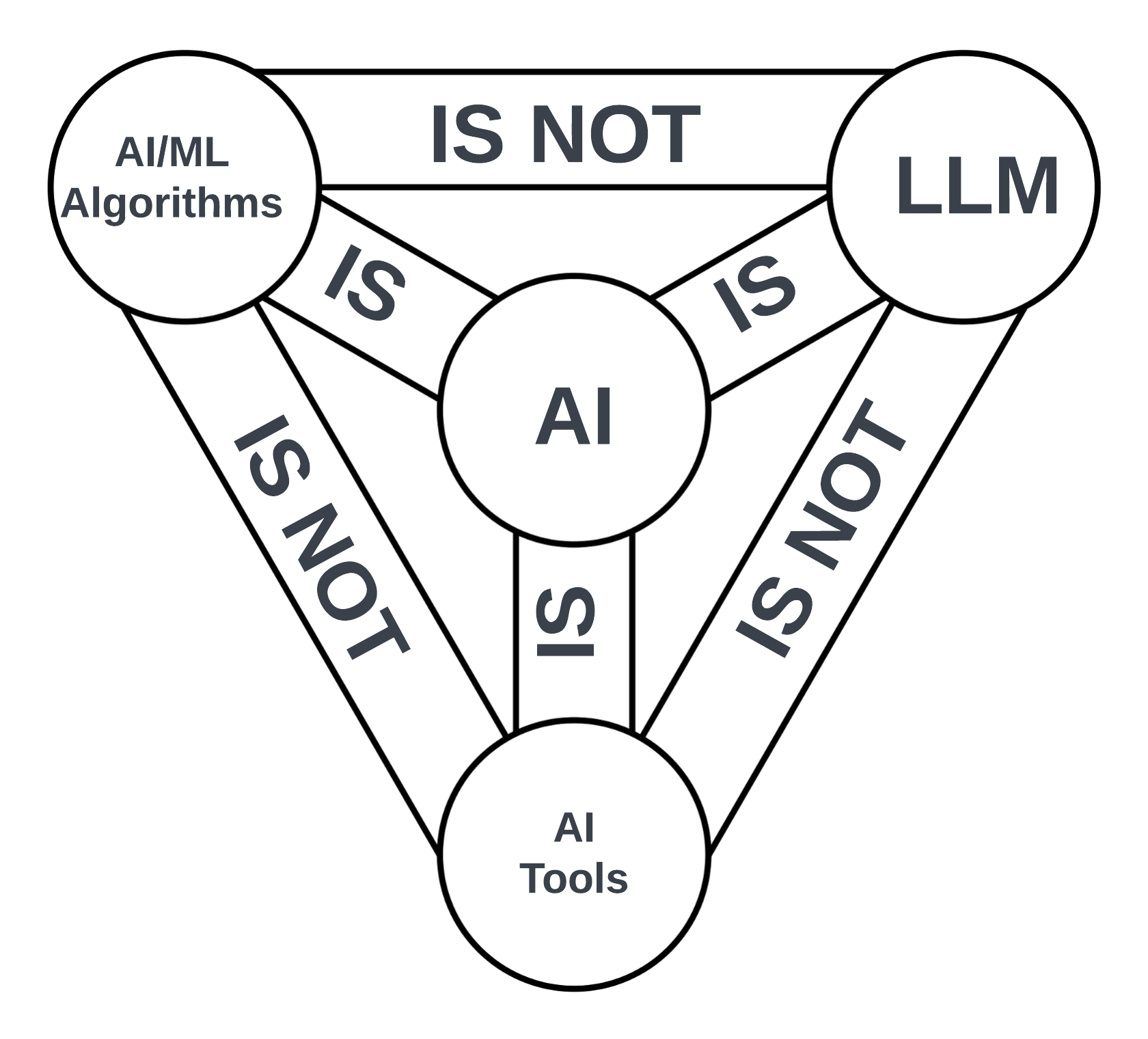 Näistä syntyy kolmiyhteys: tekoäly on samaan aikaan sekä LLM-palveluita, organisaatioille tehtyjä tuotteita sekä algoritmeja, mutta algoritmit eivät tarkoita pelkästään LLM-teknologiaa eikä pelkästään työkaluja eivätkä työkalut ole pelkästään LLM-palveluita.